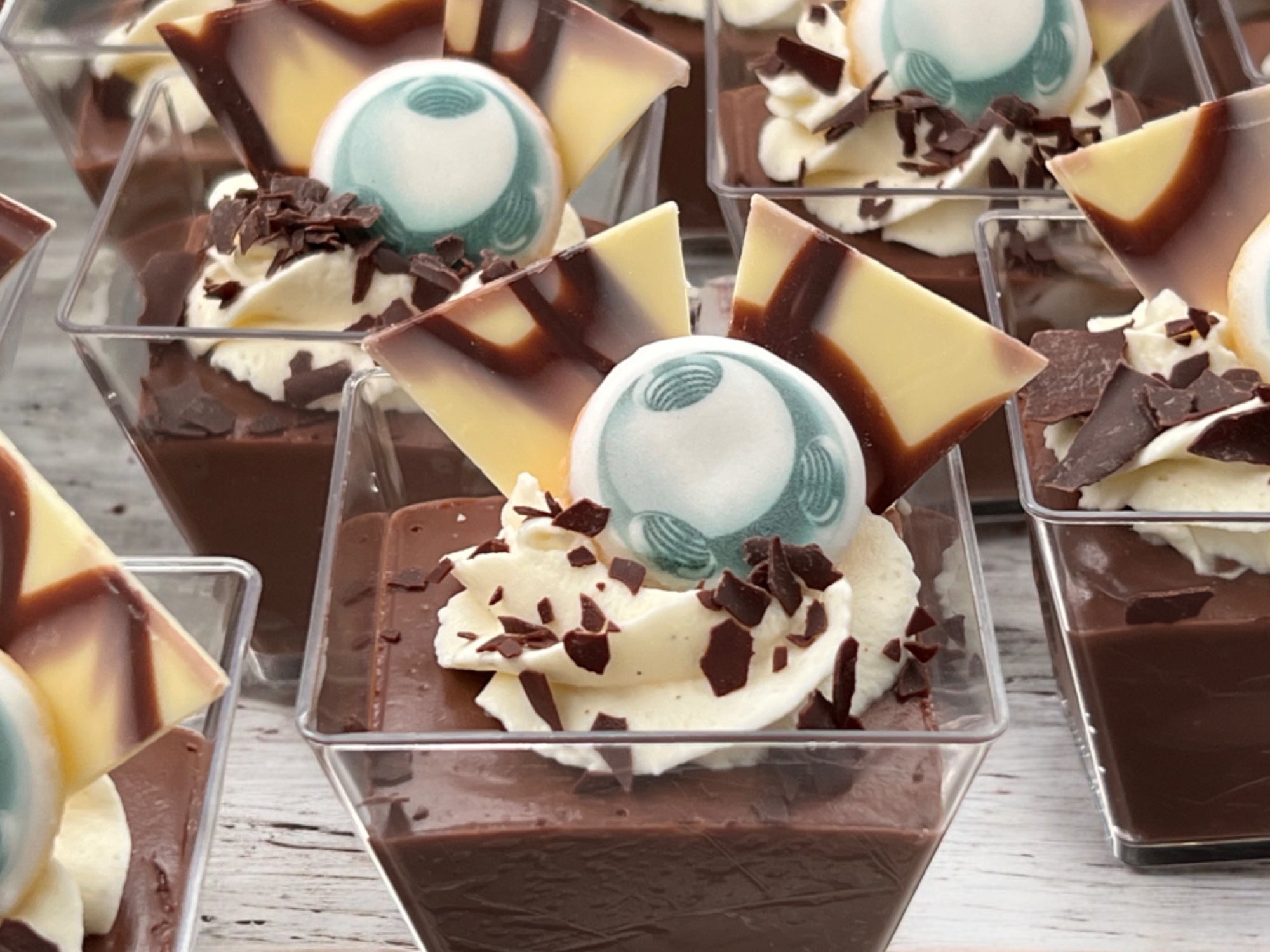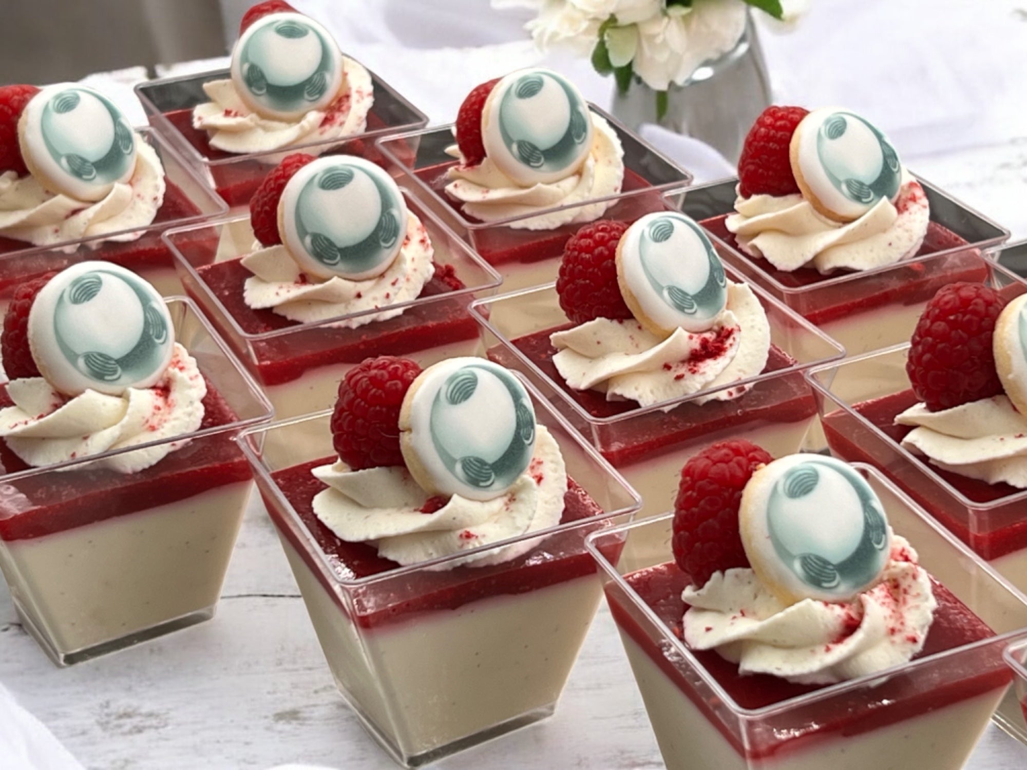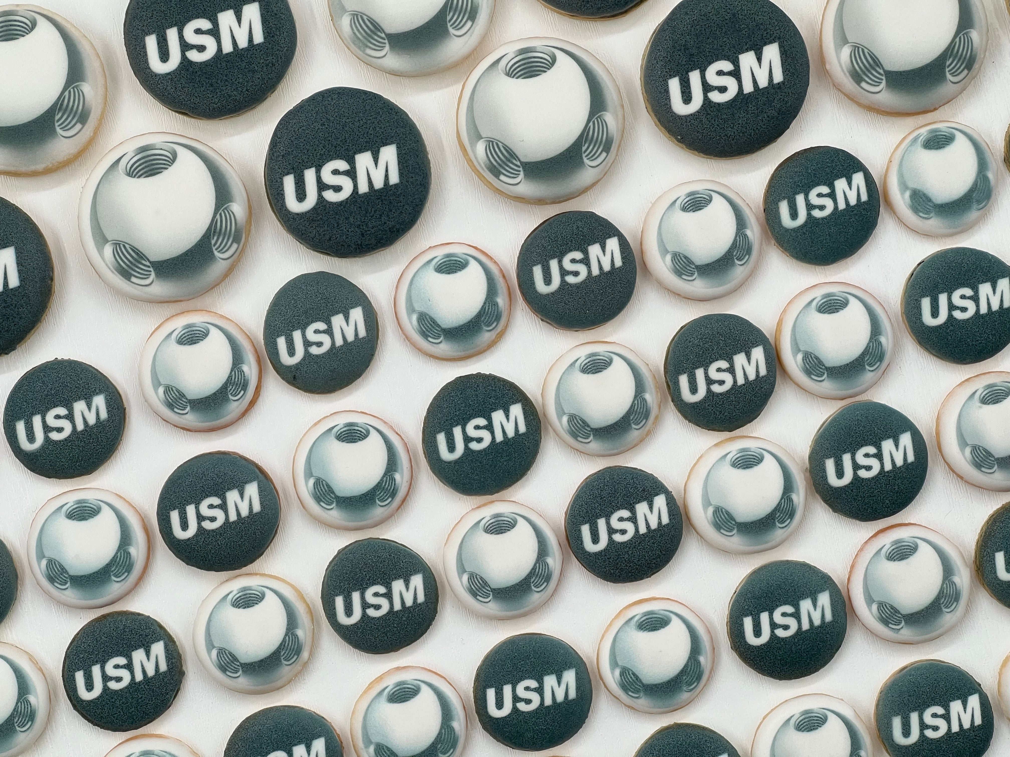 Die Mitarbeiter durften sich an verschiedenen Desserts erfreuen. Gewünscht waren Himbeermousse mit frischen Himbeeren, Schokoladenpudding mit Schokoladenstücken, Tiramisu, Zitronenquark mit einem saftigen Biskuitboden und Panna Cotta mit einem Himbeerspiegel. Alle Desserts wurden dekoriert mit einer Vanille-Mascarponecreme oder Rahm. Als Highlight gab es natürlich die legendäre USM-Kugel und das Logo auf einem Mini-Sugar-Cookie.